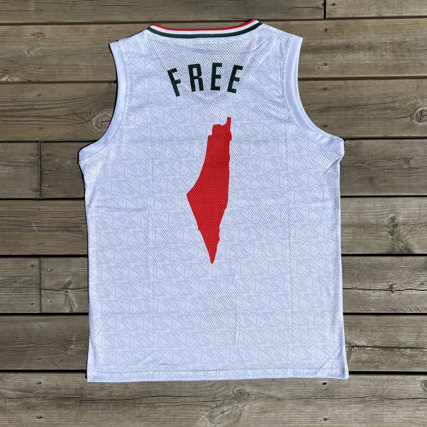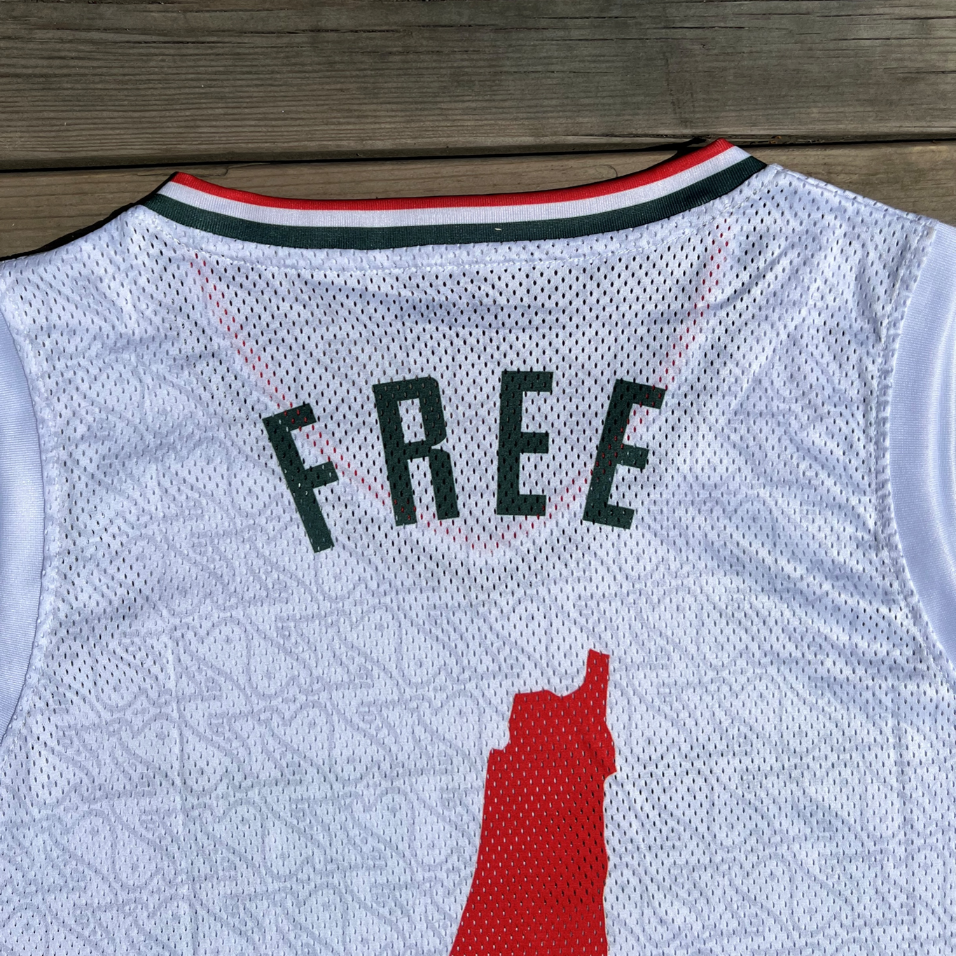 Yet another statement piece is here. This GAME ON JERSEY in white has the palestinian colors as accents aswell as a tonal "PALESTINE" in arabic calligraphy as background